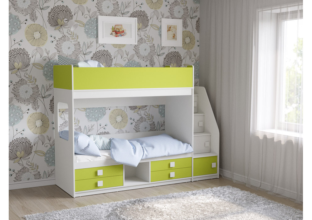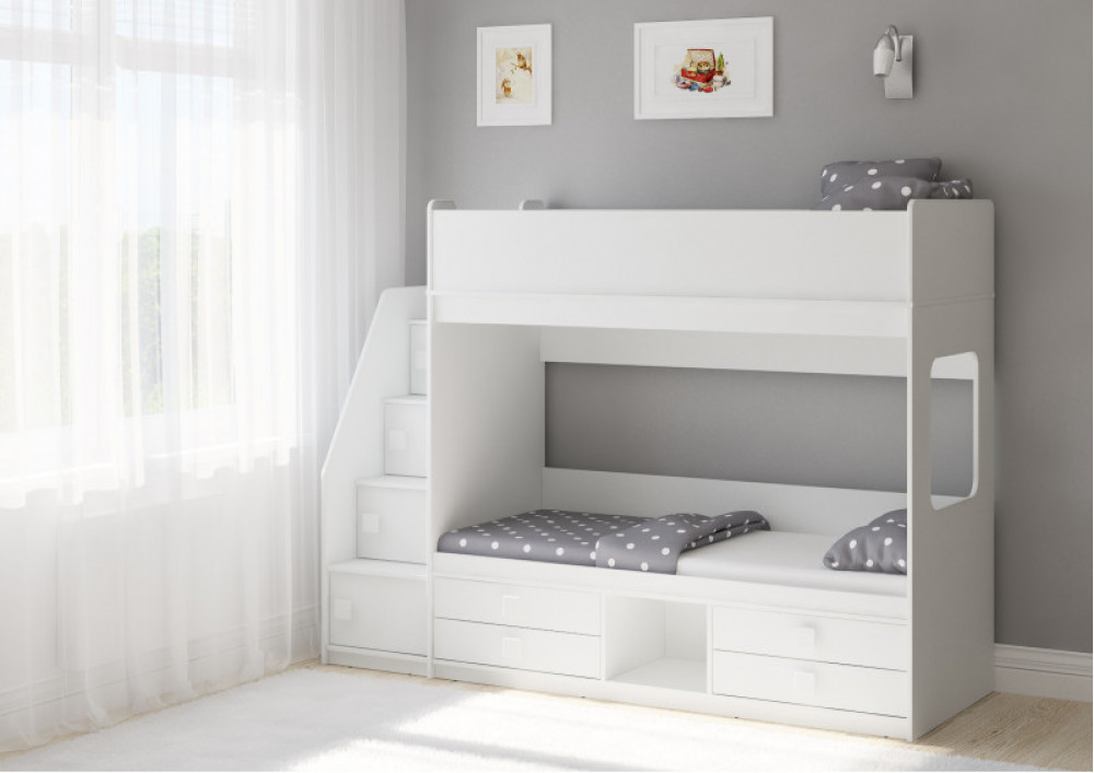 Классическая детская двухъярусная кровать с двумя параллельными спальными местами размером 1750х750 и 1900х750, выдвижными ящиками для хранения и угловой лестницей-стеллажем.