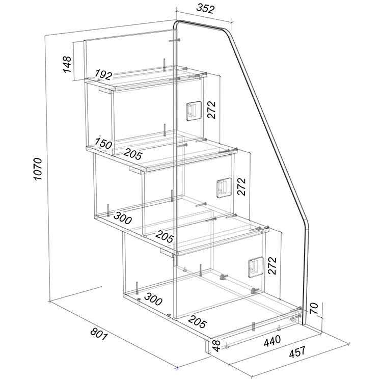 Интегрированная угловая лестница оснащена боковым бортиком и местами для хранения с ручками плавной формы, без острых углов.